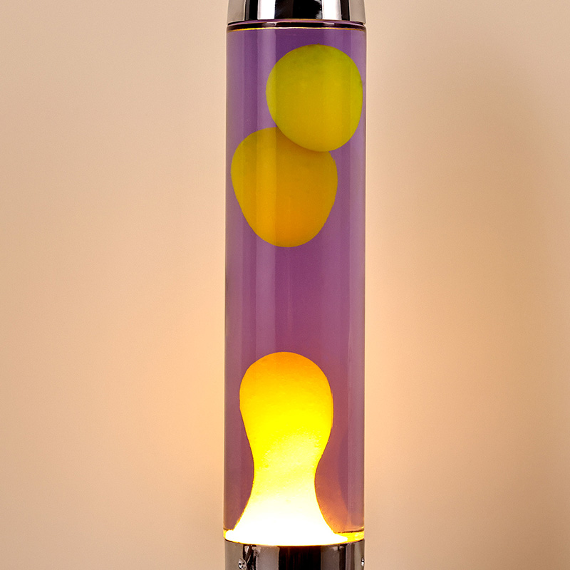 ロケットシェード付きの大型LED Lavaランプは、クラシックなロケット型のデザインが特徴で、シルバーの金属シェルと透明なガラスボトルの本体が組み合わされており、シンプルでありながらスタイリッシュです。中の紫色の液体に黄色が浮かんでいます