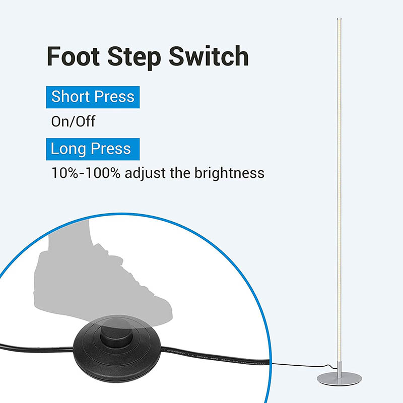 利便性を念頭に置いて設計されたLEDフロアランプは、簡単に操作できるフットスイッチを備えています。スイッチを踏むだけでランプがオンまたはオフになり、ボタンやスイッチを手探りすることなく照明を簡単に制御できます。この思慮深いデザインの詳細により、全体的なユーザー エクスペリエンスが向上し、ランプの操作が可能な限りシンプルかつ直観的になることが保証されます。