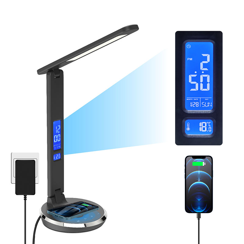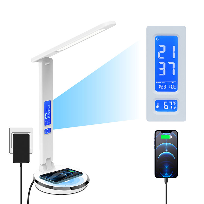 温度表示、時間、目覚まし時計、背面の本体制御ボタンを備えた永久カレンダーを備えたLCDスクリーンがあります。そして、電気スタンドのシェードの後ろにUSB充電ポートがあります。