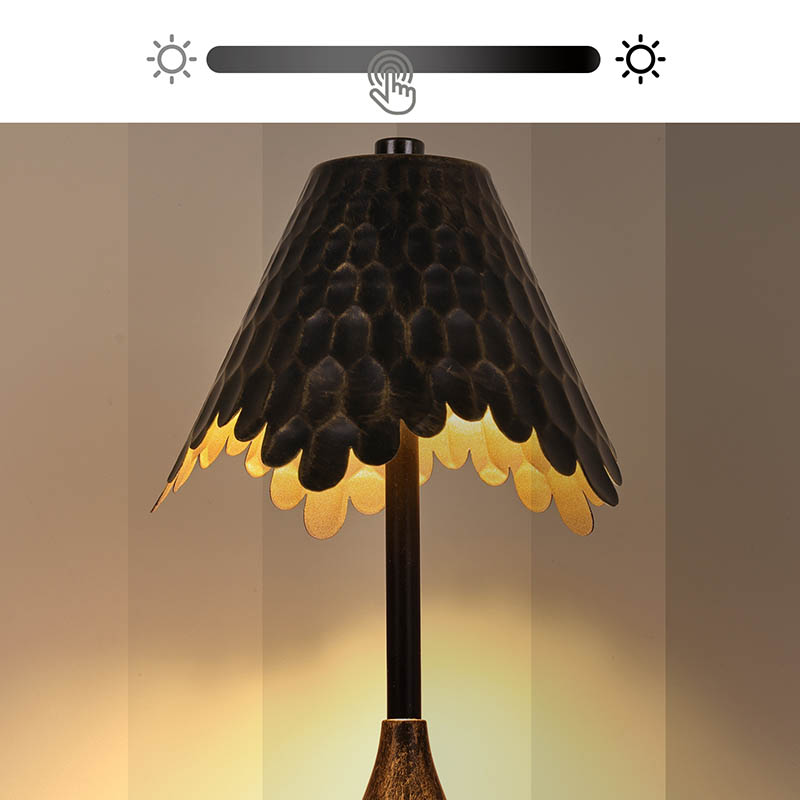 このランプの中心は、複雑な金色の葉のパターンで飾られた繊細なキノコの帽子を連想させる印象的な傘のようなトップです。このデザインは、自然にインスパイアされた美しさを周囲に追加するだけでなく、光源の機能的拡散カバーとしても機能し、目に心地よい柔らかくて輝く輝きを作り出します。
