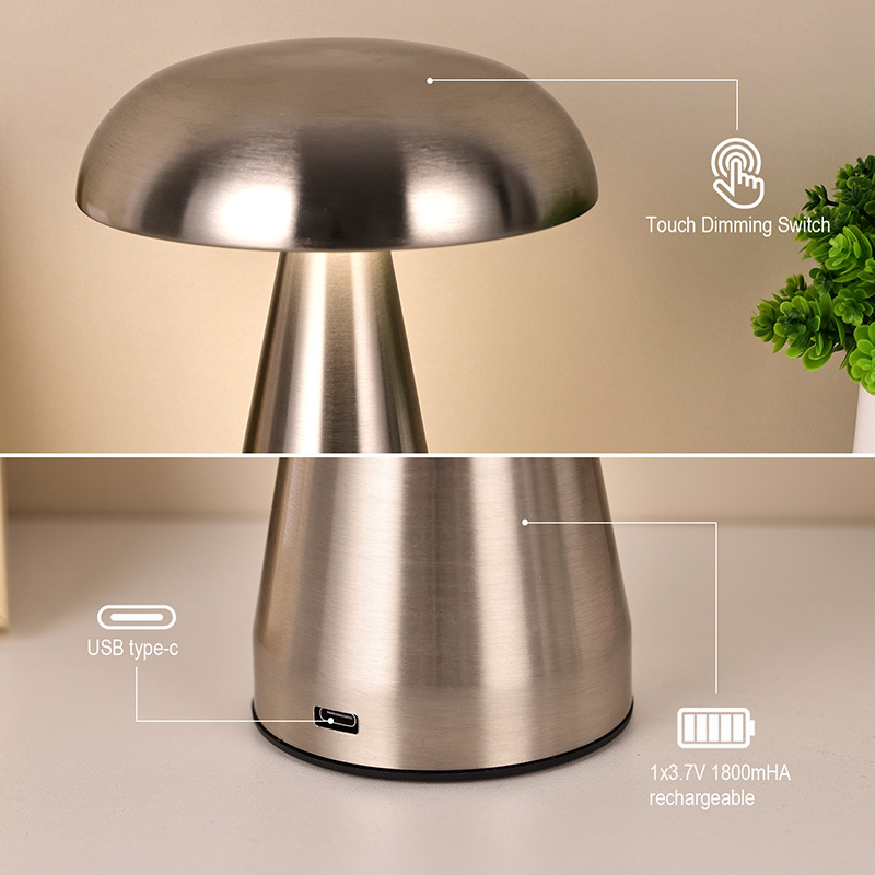 キノコシェード付きの全体金属製のLEDデスクランプは、ベースの下にUSB type-c充電式があり、内部で1800maバッテリーを充電できます